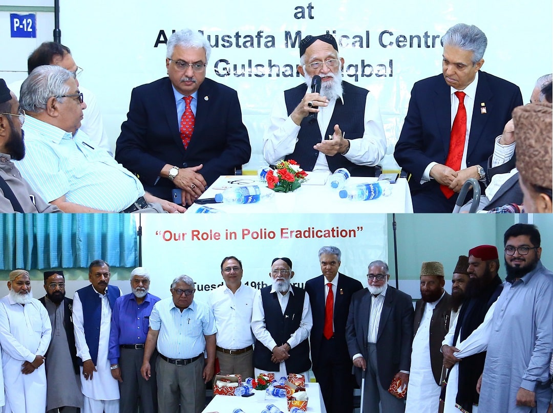 Chairman Al-Mustafa Welfare Society is also the Chairman of Rotary Scholars Committee for Polio eradication. We organized a seminar of scholars and discussed about their role in Polio eradication at Al-Mustafa Medical Centre Gulshan. Our Chairman Dr. Haji Muhammad Hanif Tayyab, Chairman Rotary Polio Plus Committee Mr. Aziz Memon, District Governor Rotary Mr. Irfan Qureshi, Treasurer Al-Mustafa Welfare Society Mr. Ahmed Raza Tayyab and others spoke to the audience.